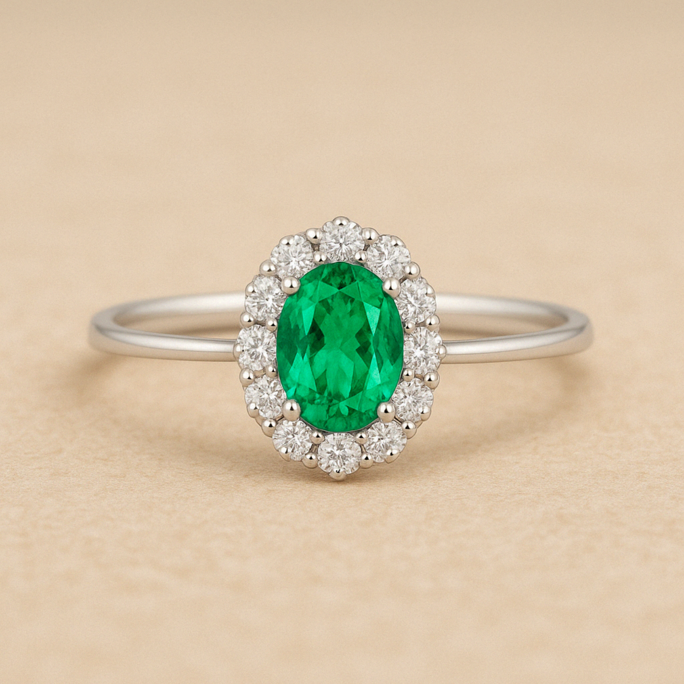 14K Classic Oval Cut Emerald Ring with Surrounding Lab Grown Diamond