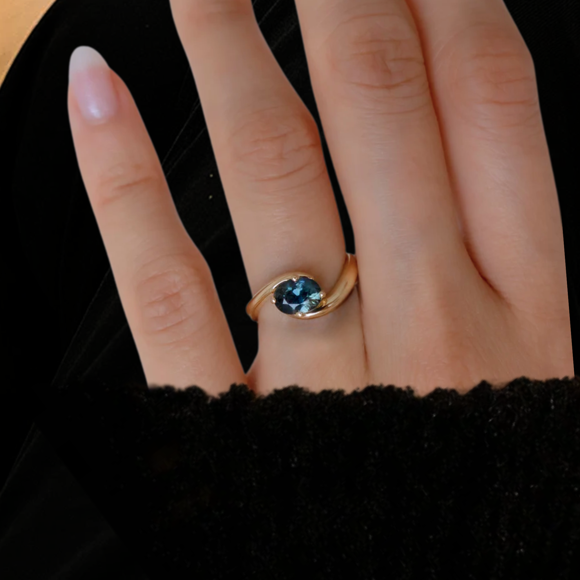 14K Blue Sapphire Engagement Ring, Oval cut Teal Sapphire Engagement ring