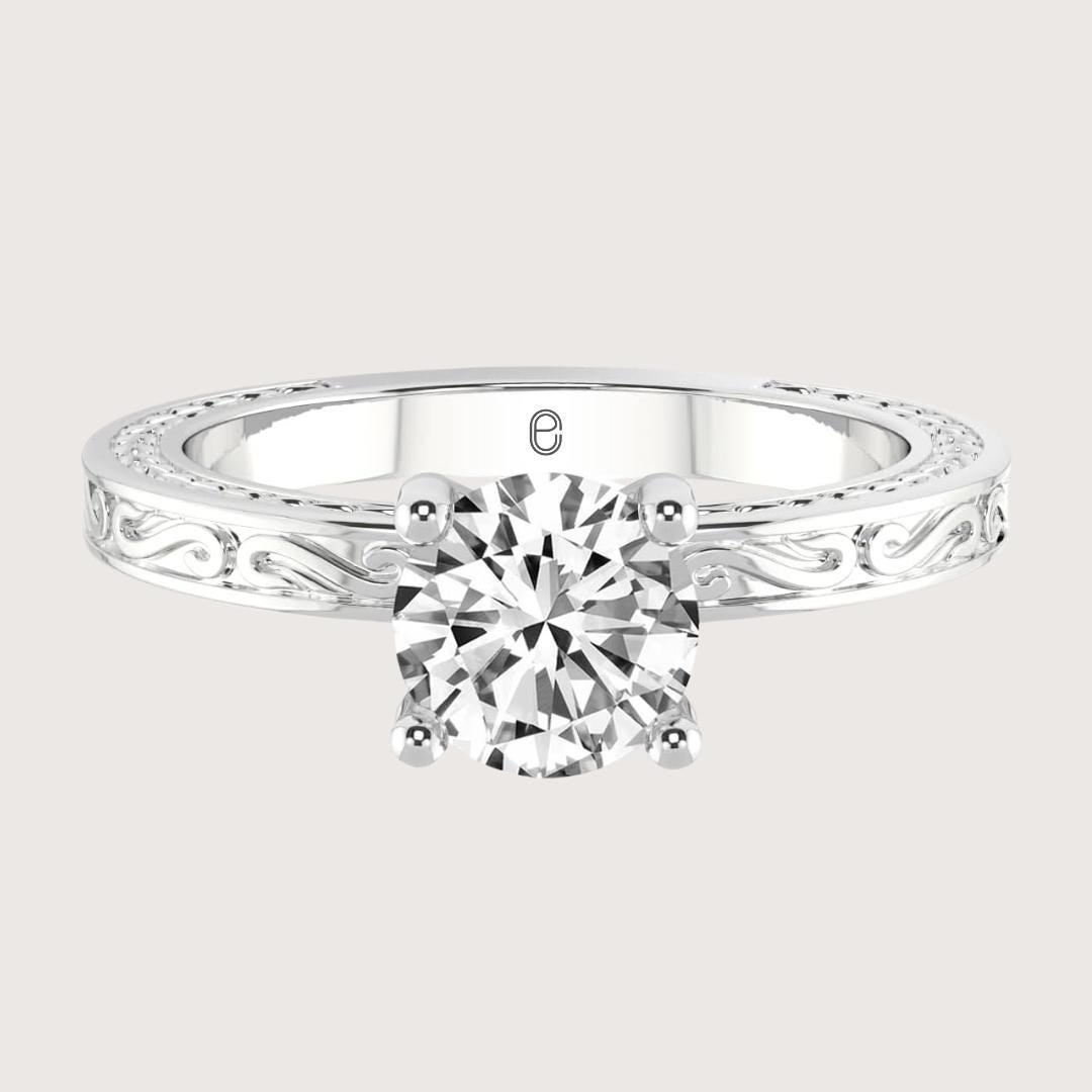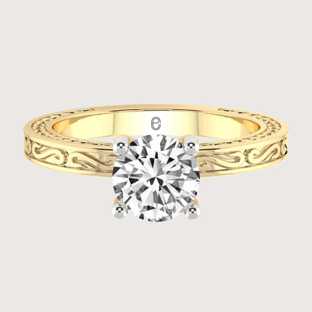 14K Gold Engraved Round Brilliant Cut Diamond Engagement Ring