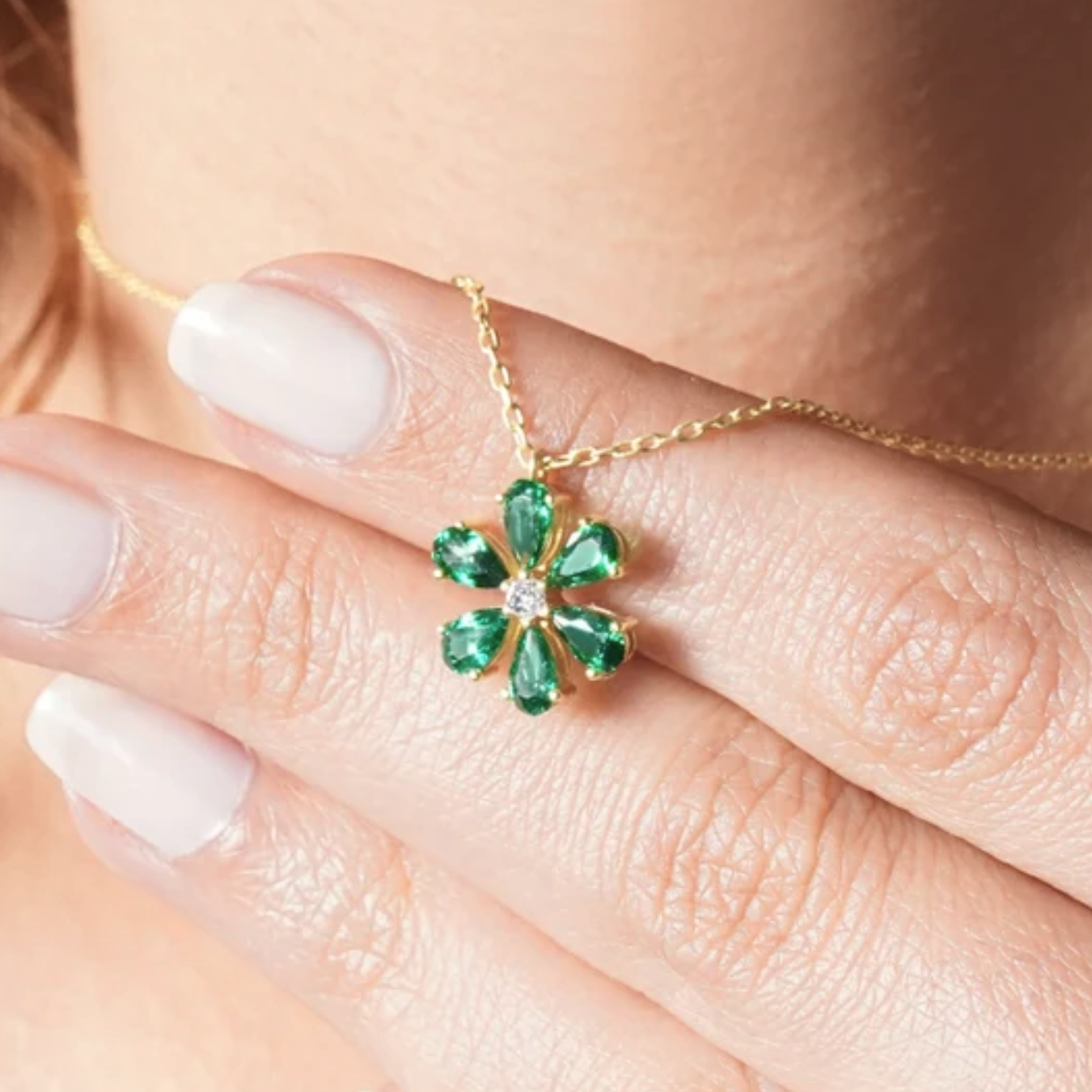 14K Solid Gold 1.00 CT Flower Diamond May Emerald Necklace