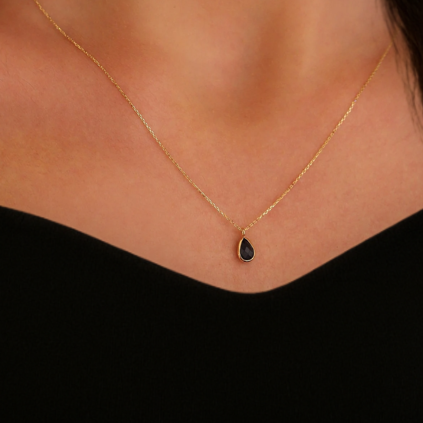 14K Solid Gold Dainty Initial Onyx Drop Pendant 2 CT Black Gemstone Pendant